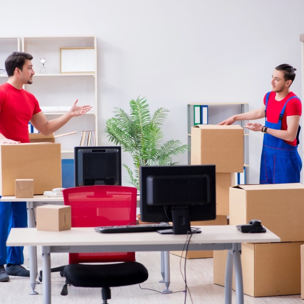 Office equipment, documents, furniture, and electronics are relocated through a structured packing and moving process.